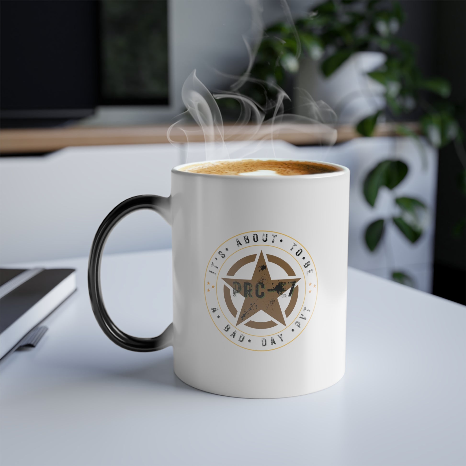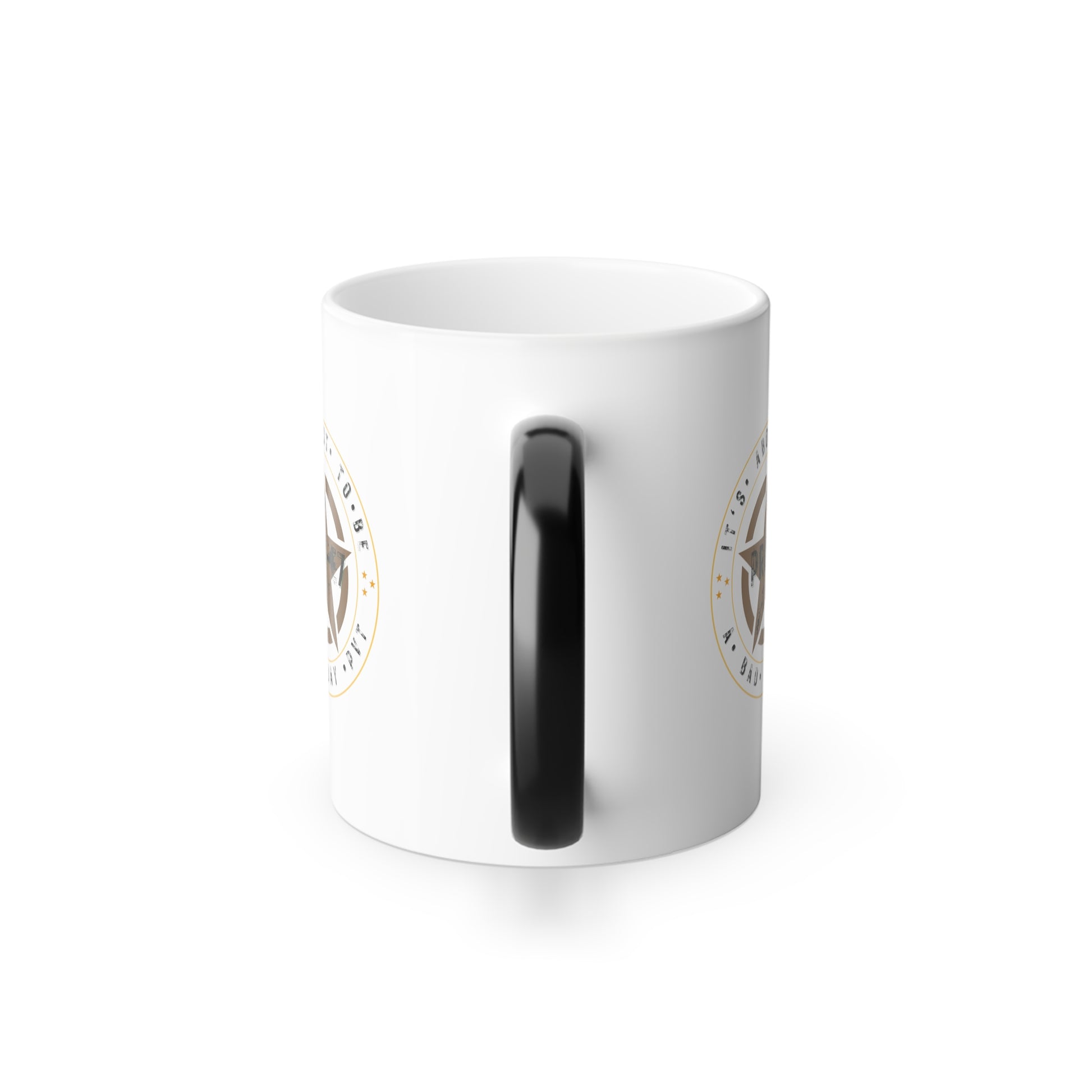 Found'em! The ceramic cup will go back to its original black outside and white inside when it cools down. The C-shaped handle helps keep a sturdy grip. It comes in one size – 11oz (0.33l) – plenty for that big morning cup of coffee.